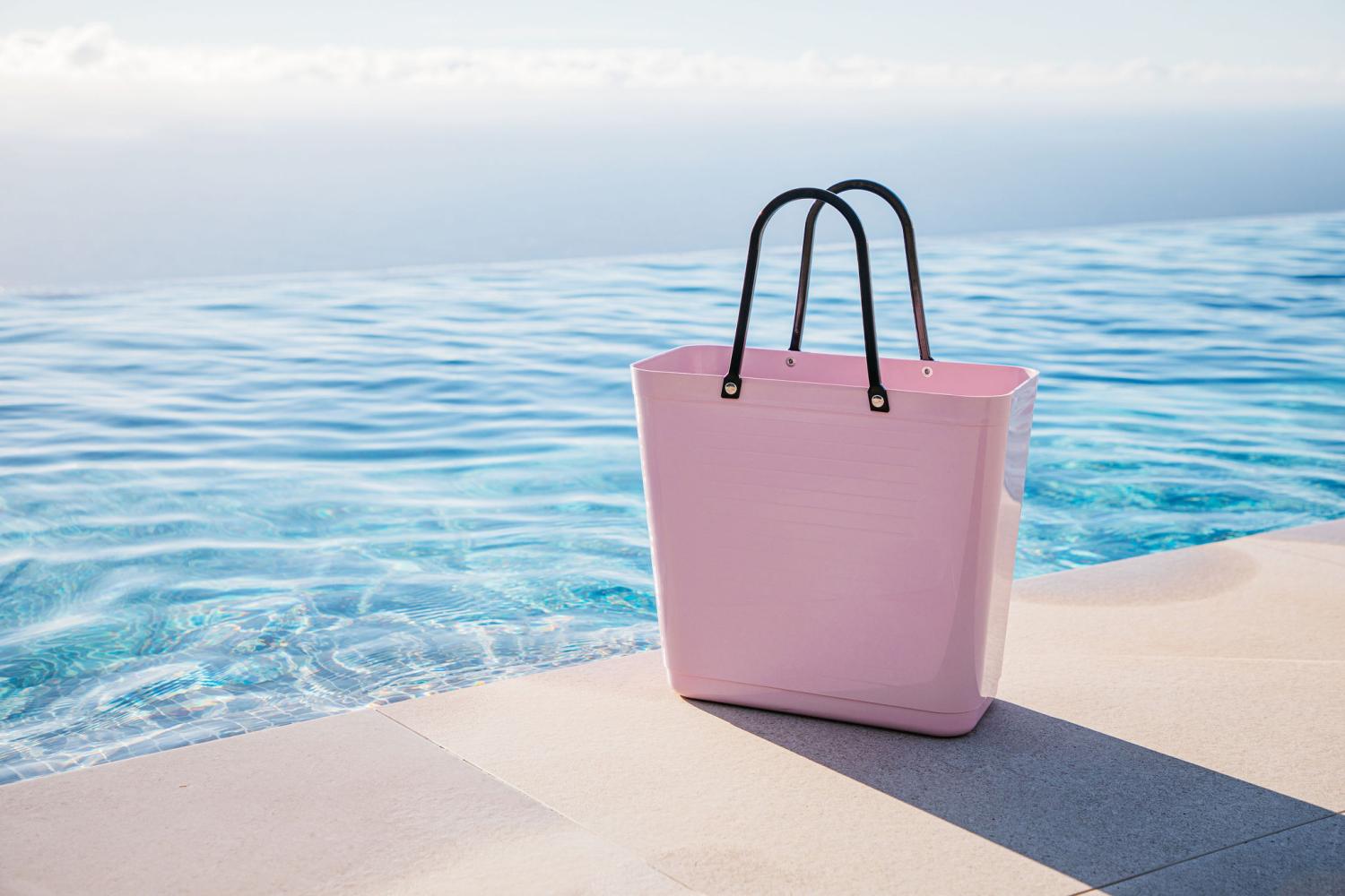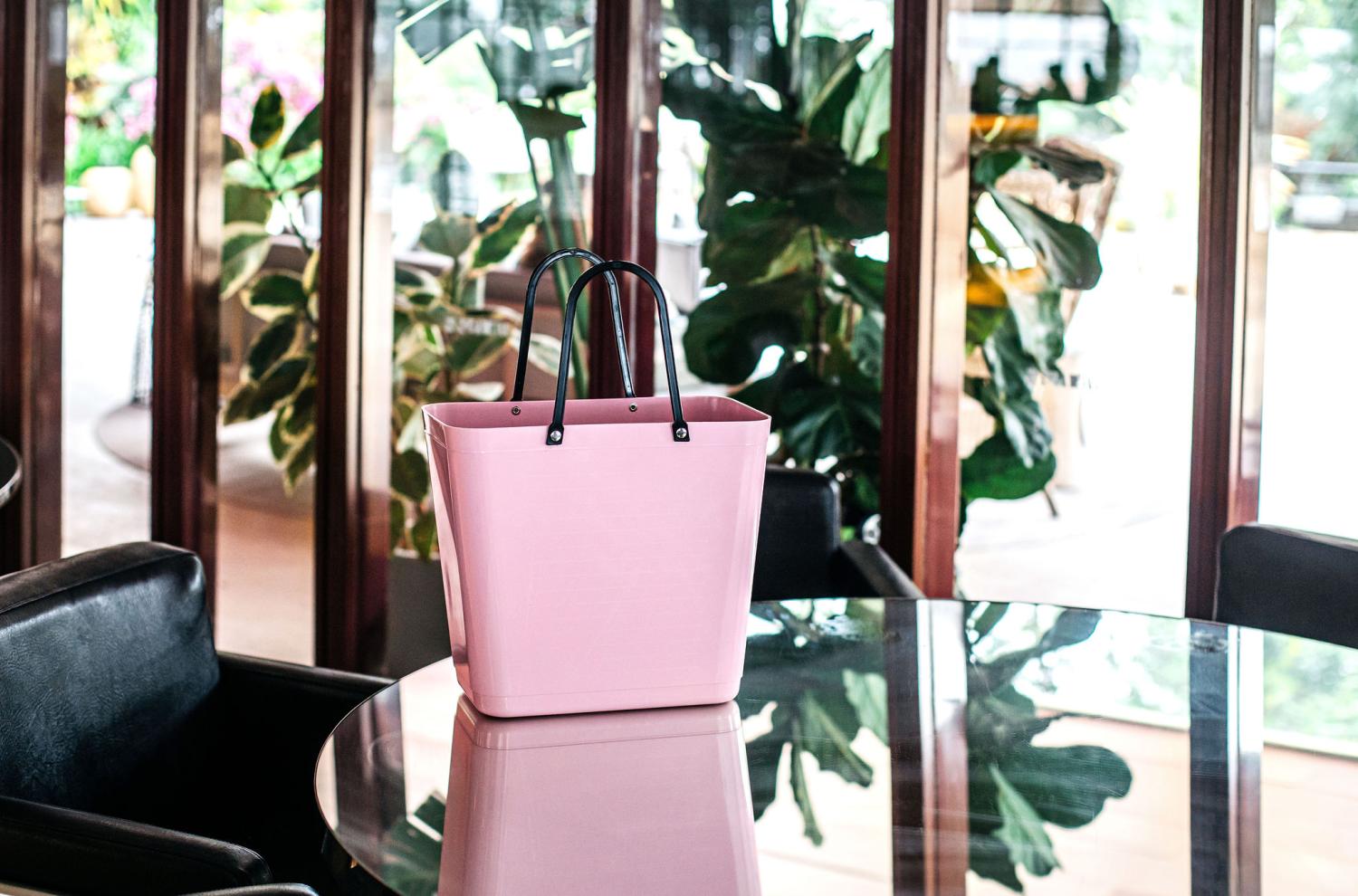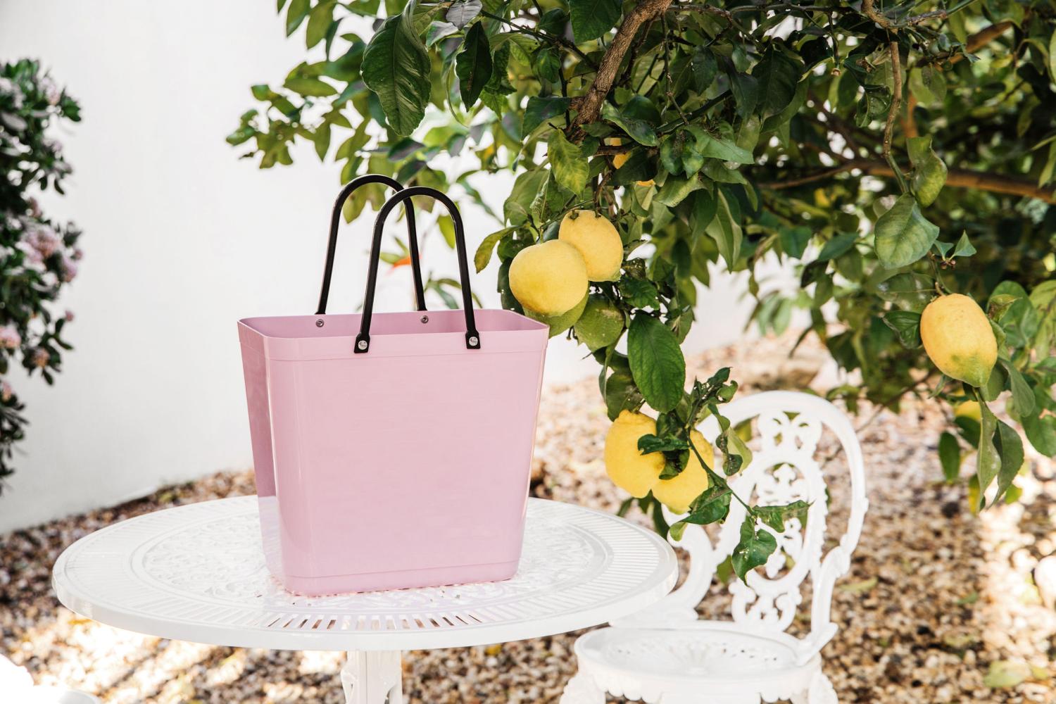 Det här är en högre och något hårdare modell av den klassiska Hinzaväskan som designades på 1950-talet. Den är perfekt att ta med till mataffären, på picknick och till stranden. Väskan har krokar på ena långsidan som gör att du kan fästa väskan på cykelns pakethållare och får på så vis en praktisk cykelkorg som går att ta av och på.